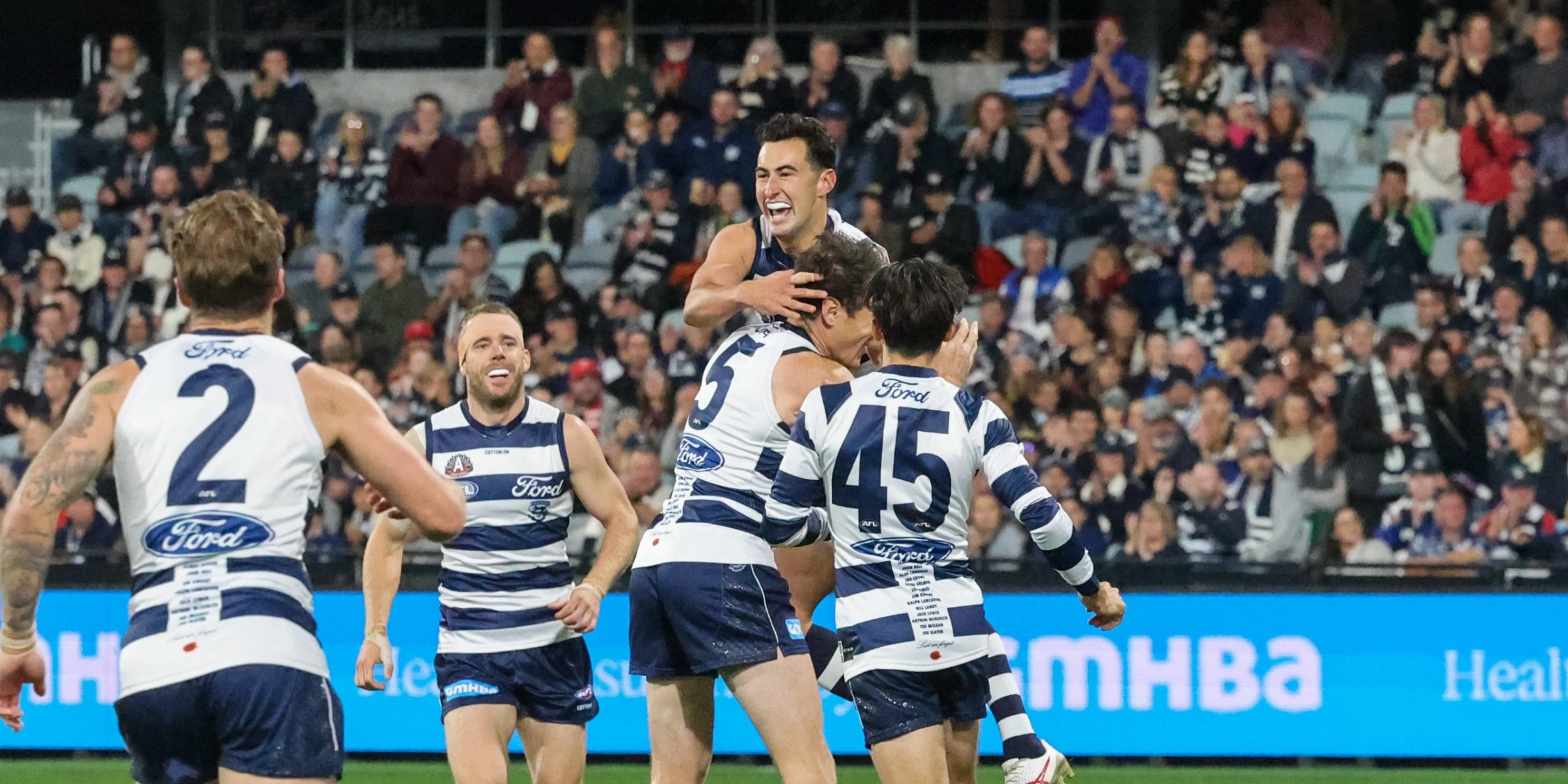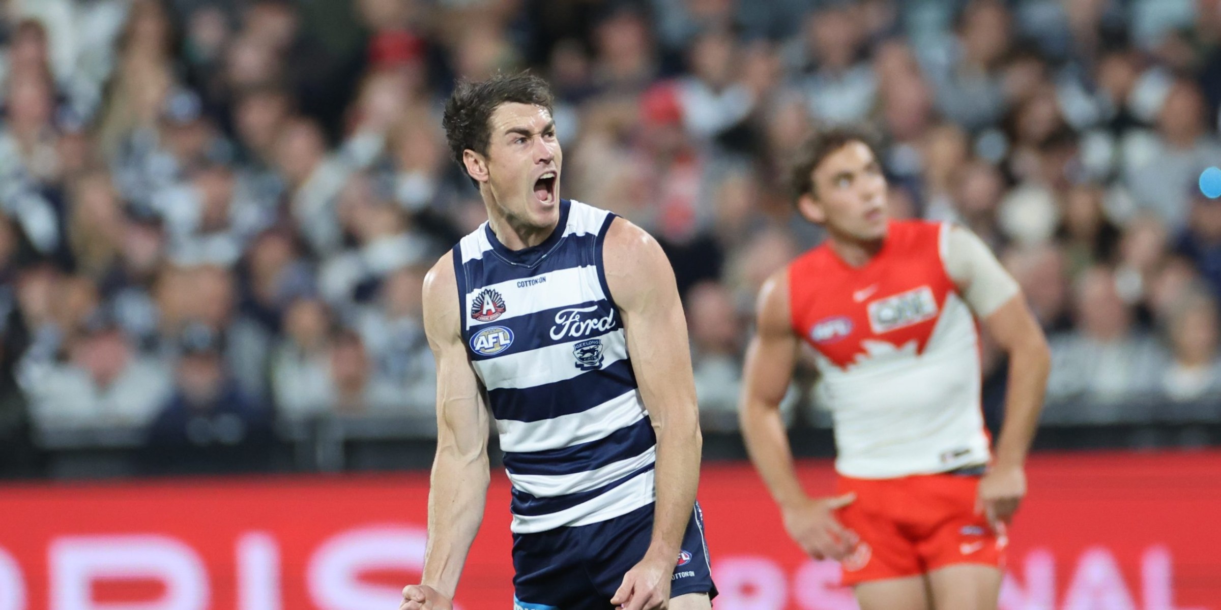 Geelong smash Swans to cap off AFL flag unveiling